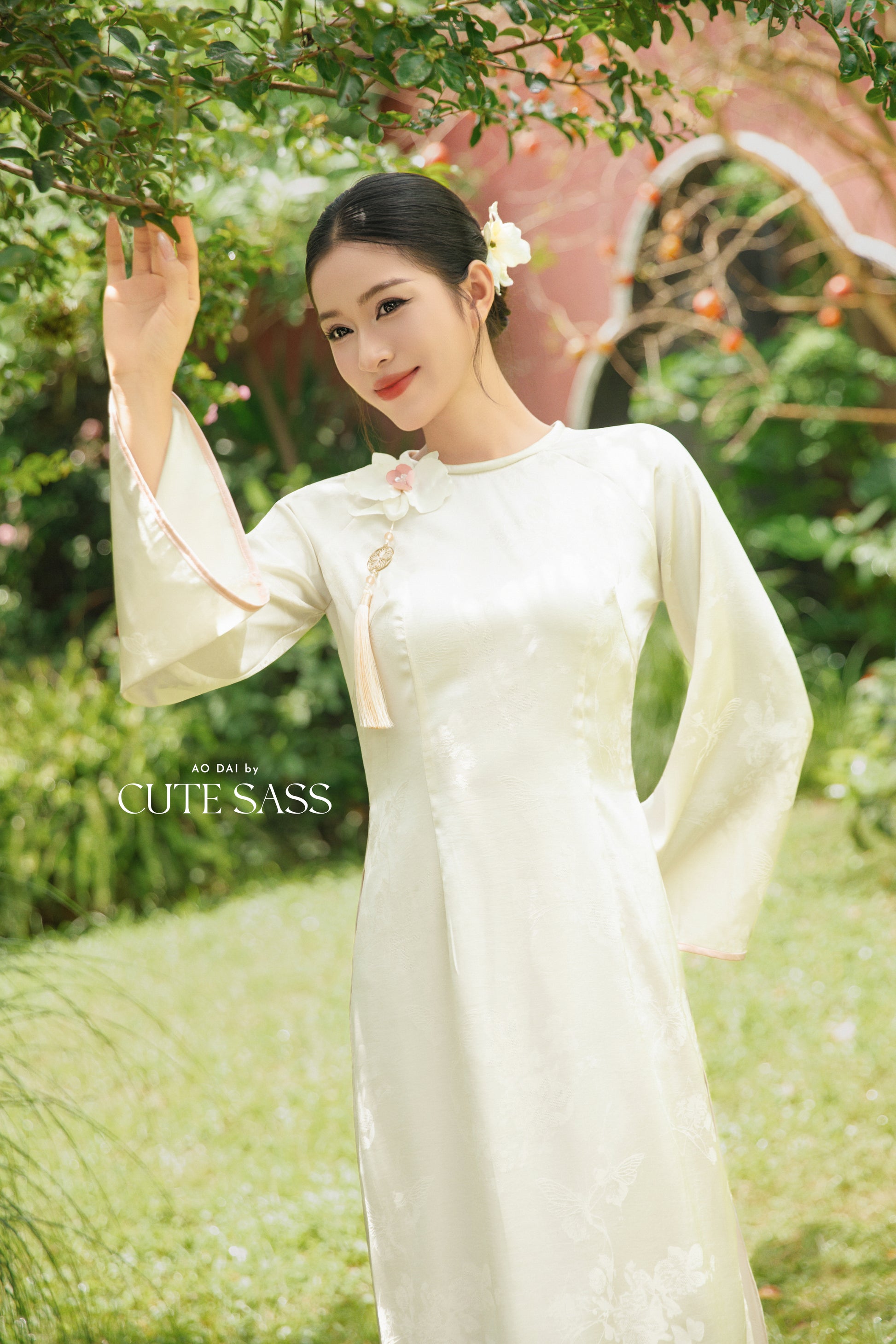 Gia Hòa - Mom and Daughter Cream with Hibiscus Flower Pin Ao Dai Set