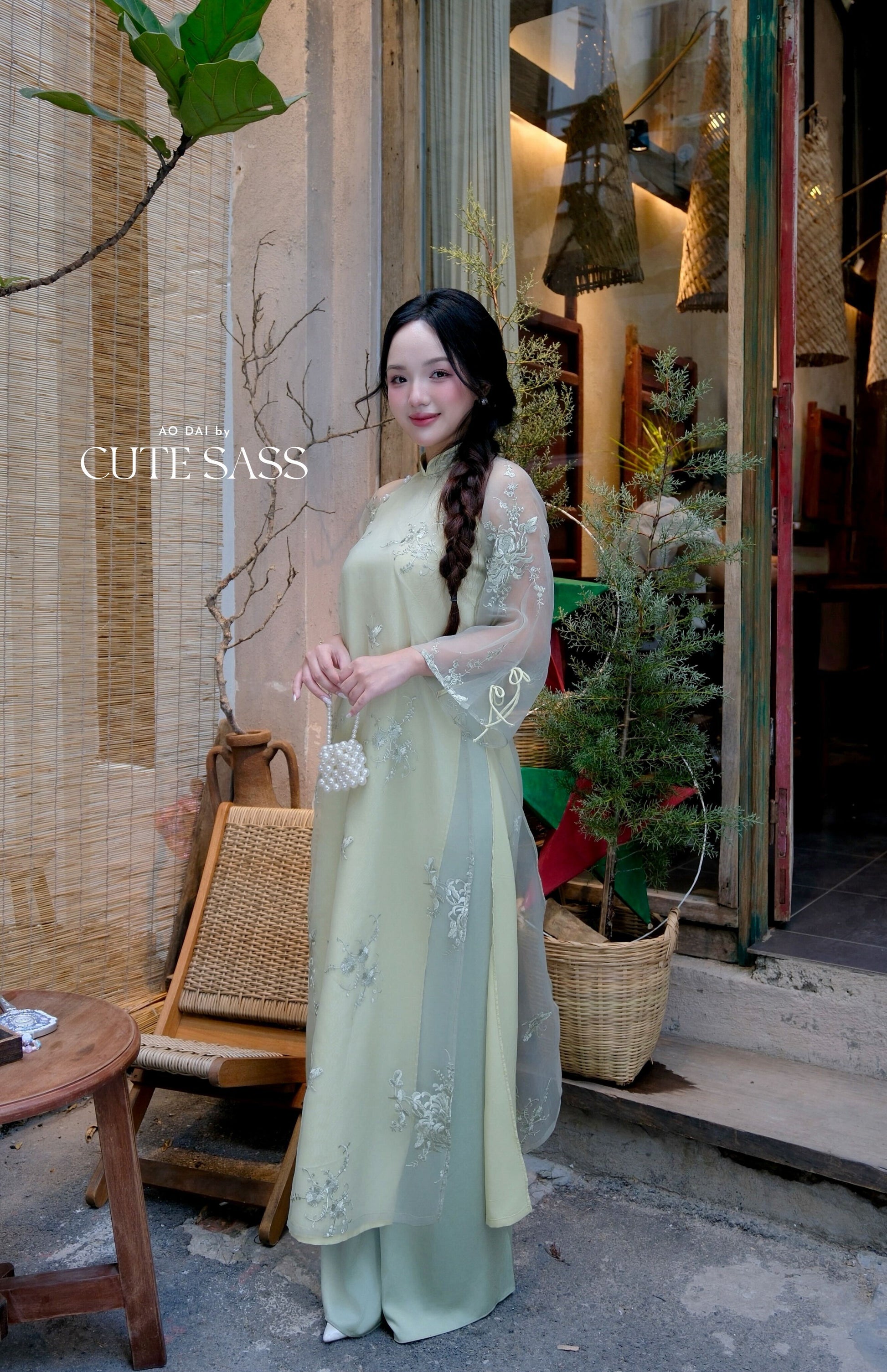 Lâm Anh - Rosette Light Green High Collar Embroidery Chrysanthemum Bow Sleeves Pearls Ao Dai Top Only, NO PANTS