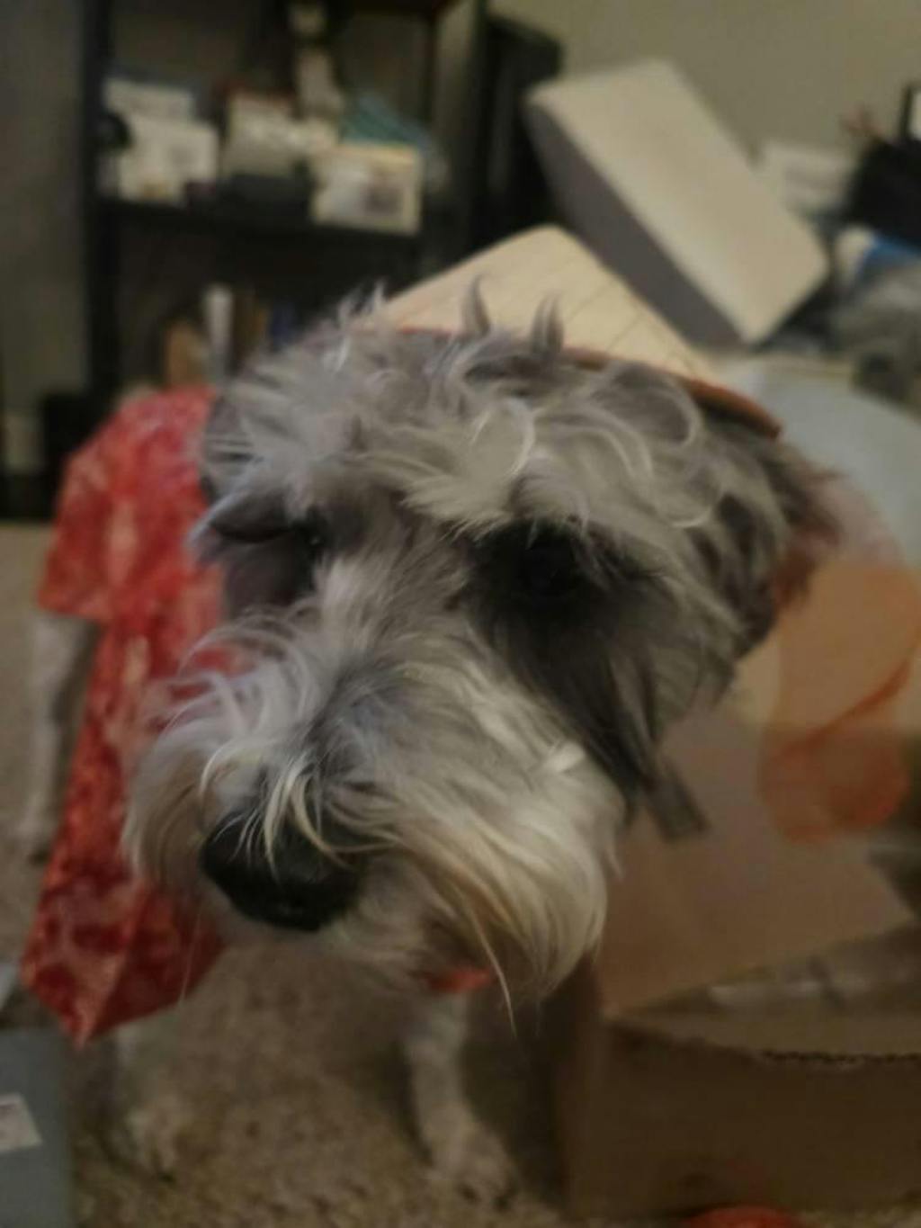 Miko (Bichon Frisé) is 5kg, 41cm chest, wearing size L strawhat (first 3 pictures) and XXL strawhat (last 2 pictures)