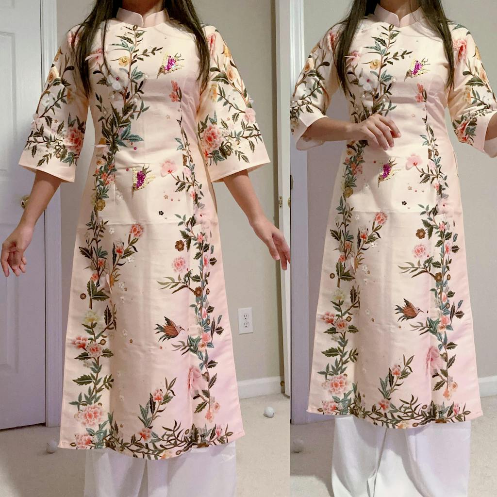 This is one of the most beautifully designed ao dais, Iβve ever seen and worn. I bought this one for tet (lunar new year) even though I already own about 6-7 sets. I absolutely love it!!