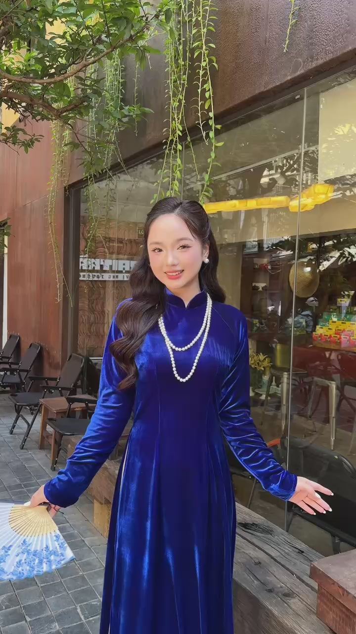 Ink Blue Velvet Plain High Collar Ao Dai Top Only, NO PANTS