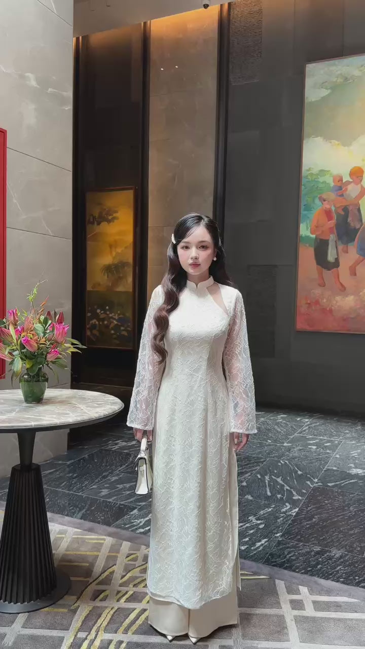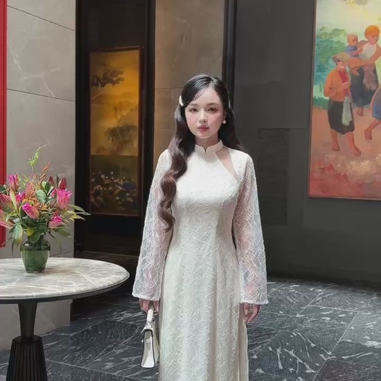 Linh Vy - Cream Lace Cutout Ao Dai Top Only, No Pants