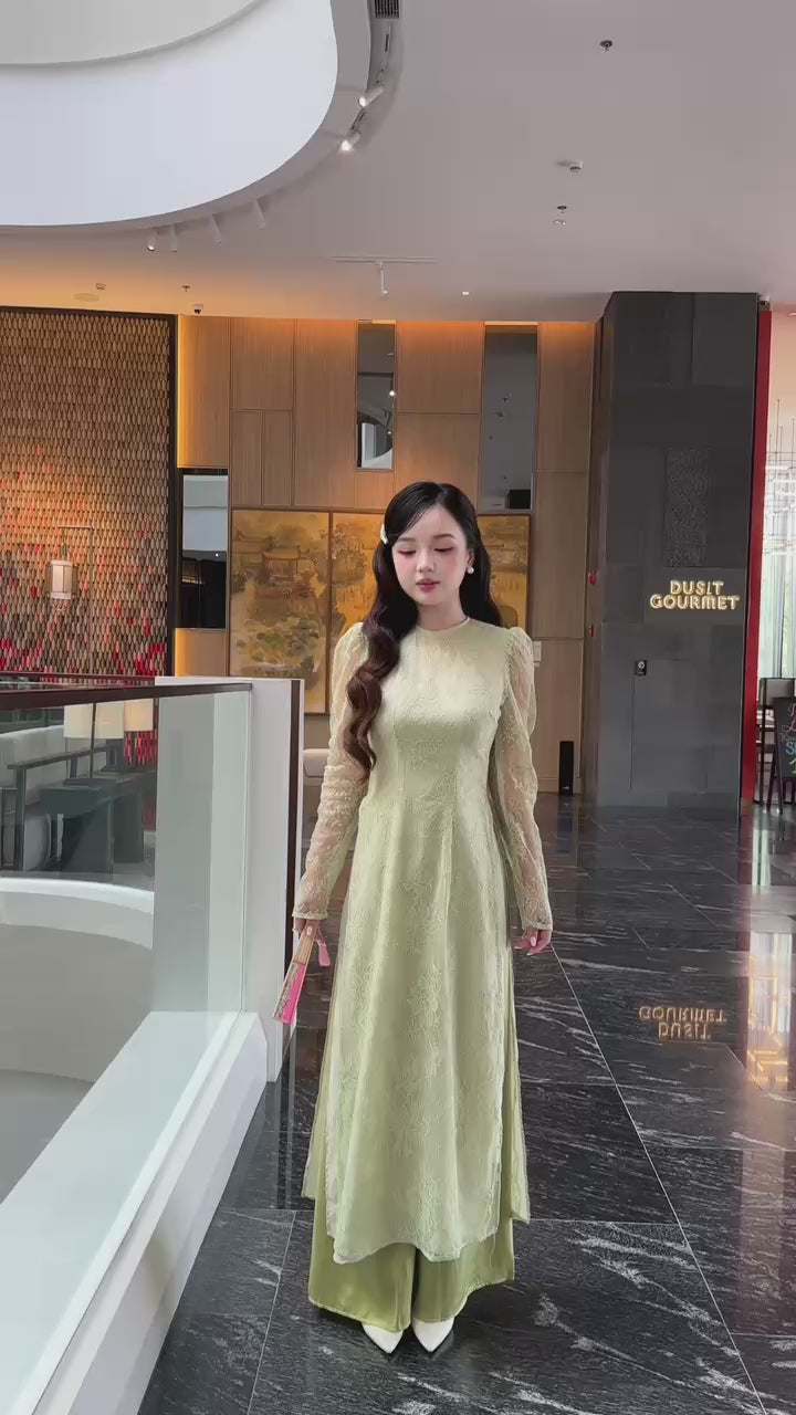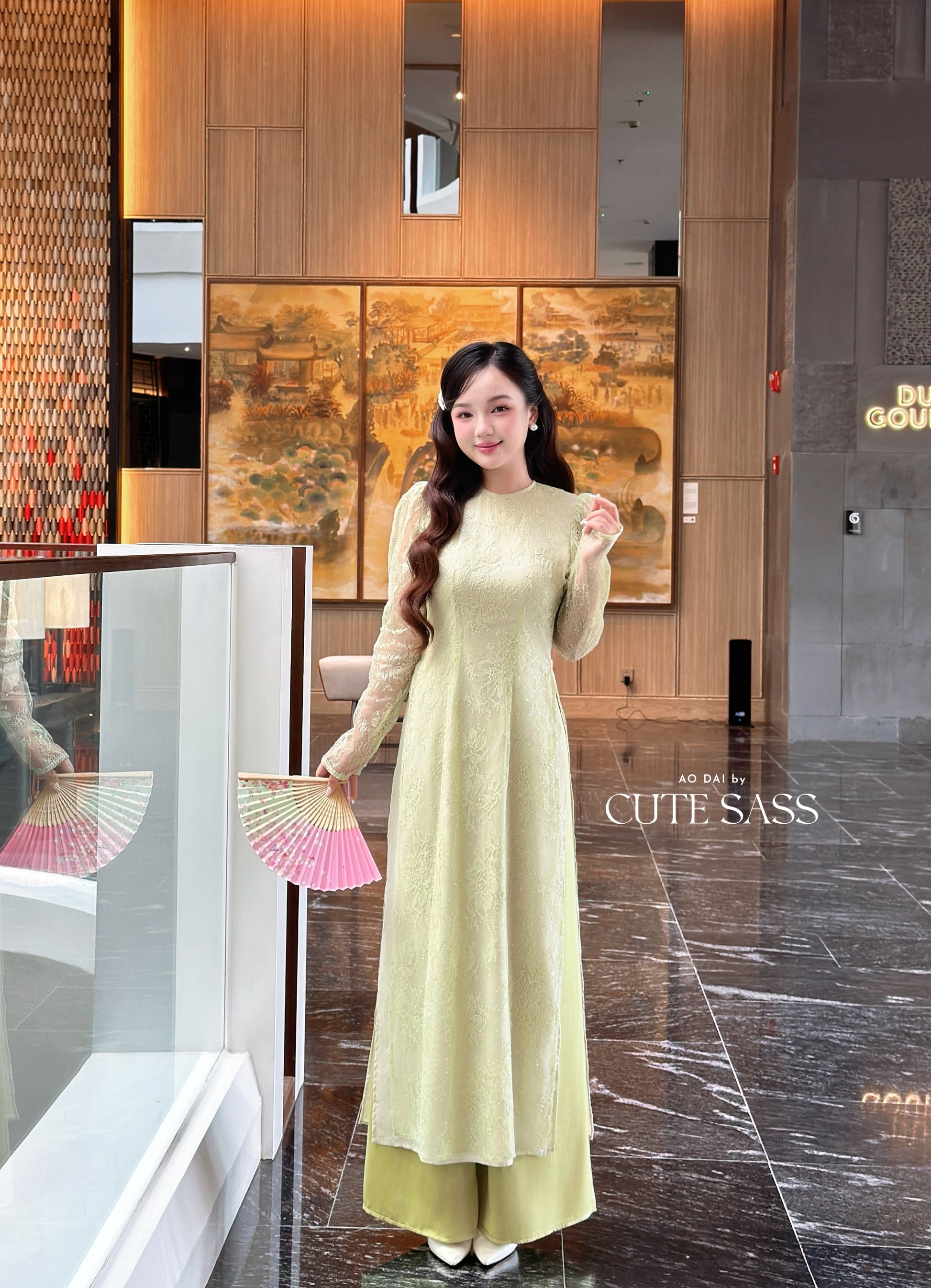 Linh Vy - Green Lace Round Collar Puffy Sleeves Ao Dai Top Only, No Pants
