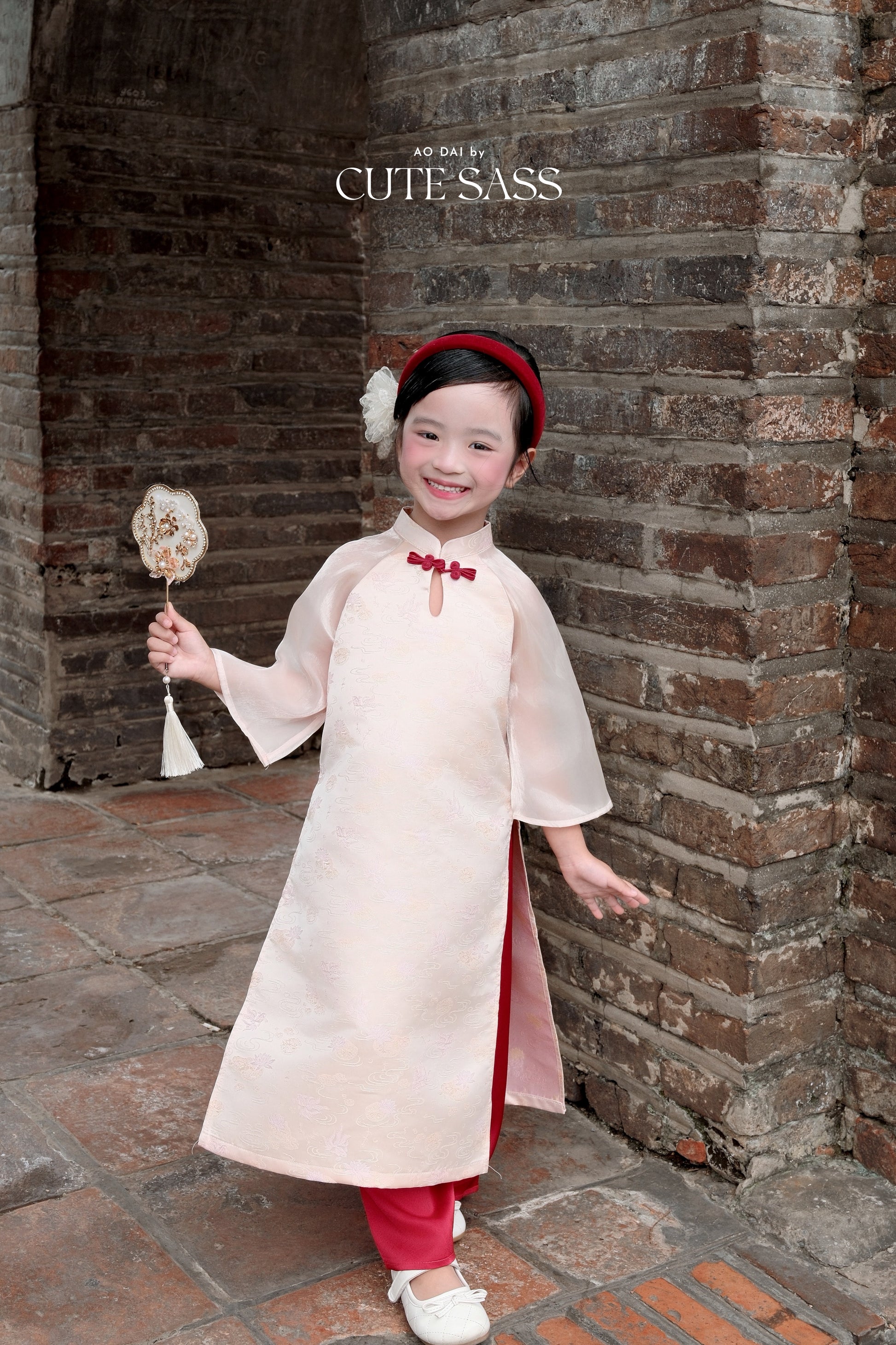 Linh Vy - Mom and Daughter Haze Cream Teardrop Cutout Red Knot Ao Dai Set