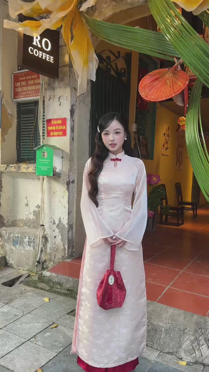 Linh Vy - Haze Cream Teardrop Cutout Red Knot Ao Dai Set
