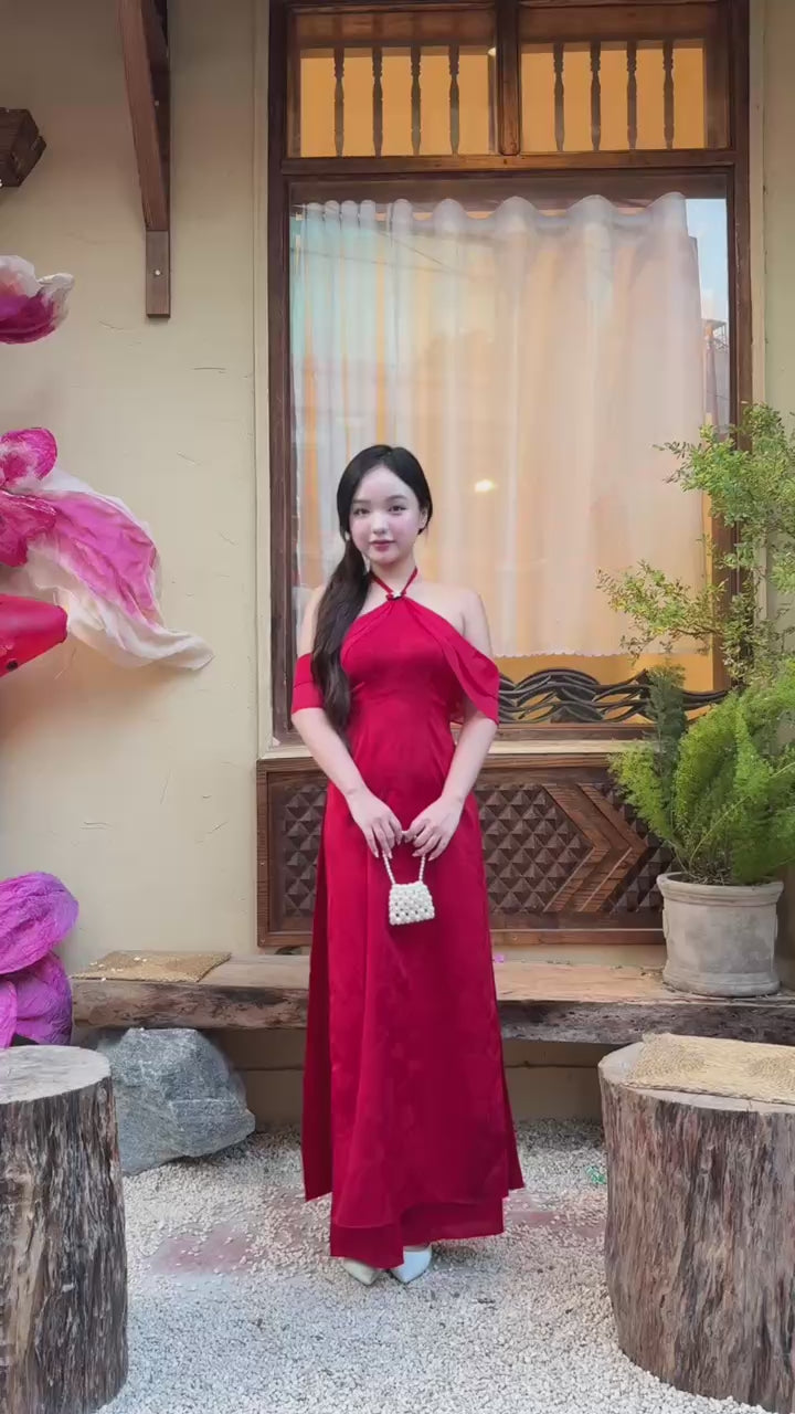 Linh Vy - Hush Red Halter Off Shoulder Wing Sleeve Ao Dai Top Only, No Pants
