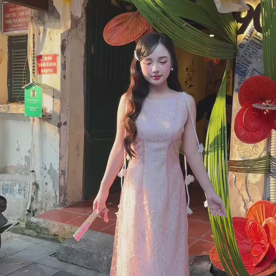 Linh Vy - Muse Light Pink Sleeveless Ao Dai Top Only and Shoulder Strings, No Pants