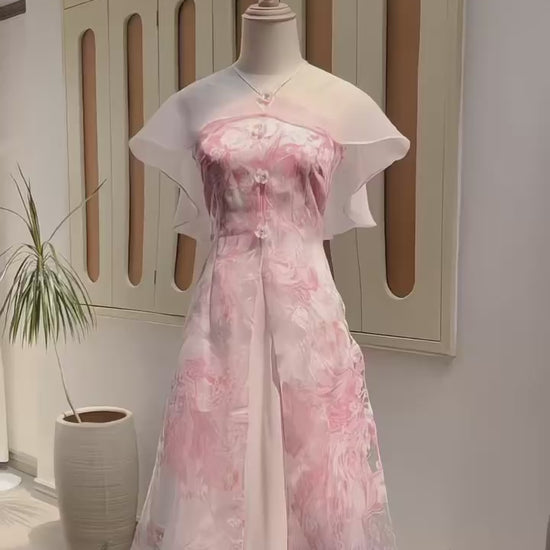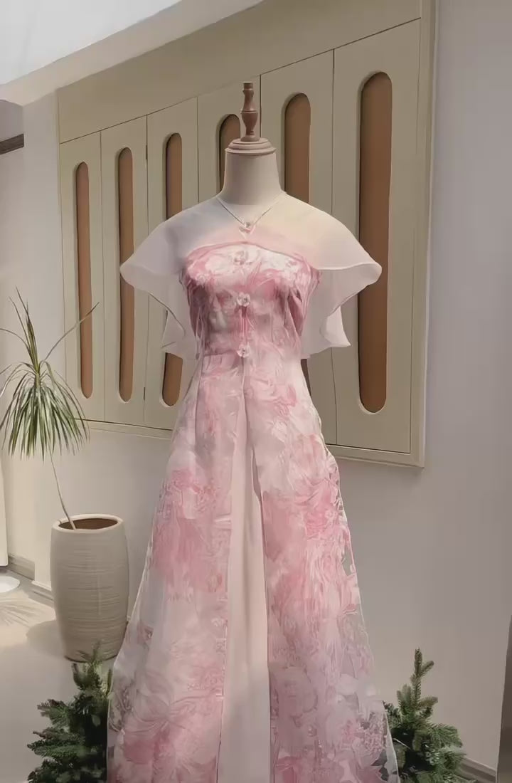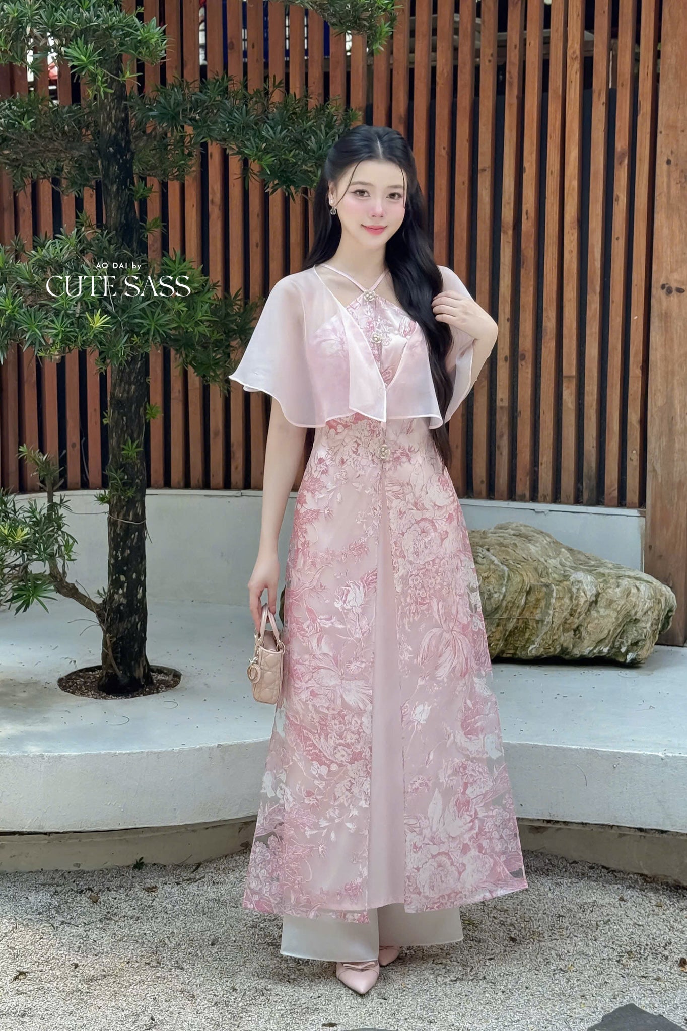 Nhu Mai - Pink Halter Front Slit with Cape Ao Dai Top Only, NO PANTS, 29A