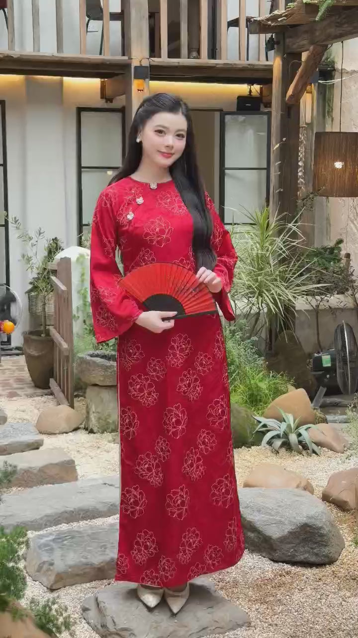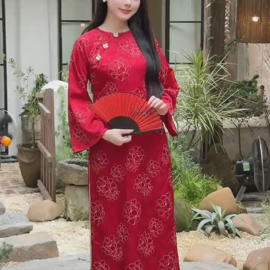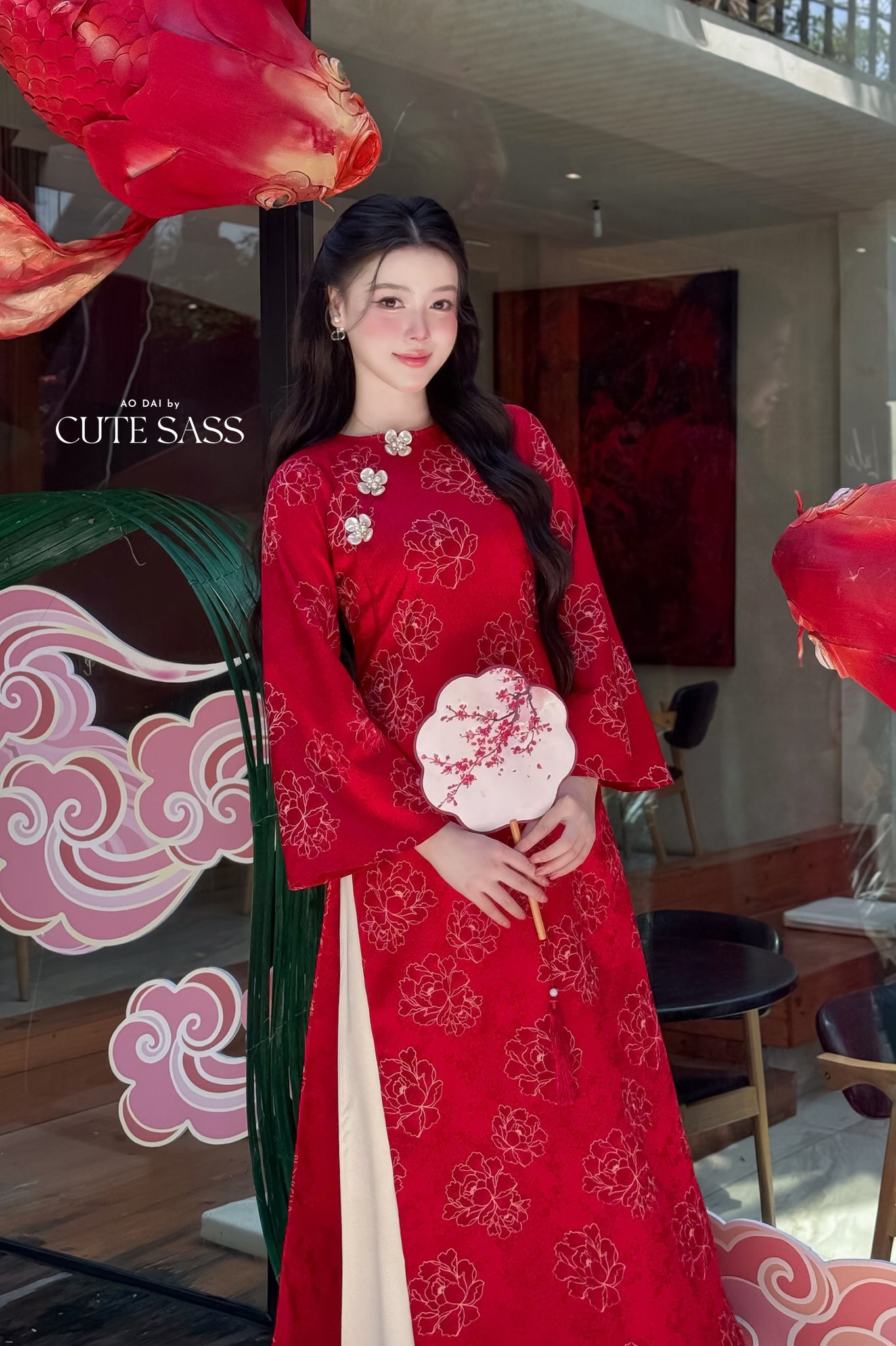 Nhu Mai - Shifted Red Shimmery Peony Ao Dai Top Only, NO PANTS 40C